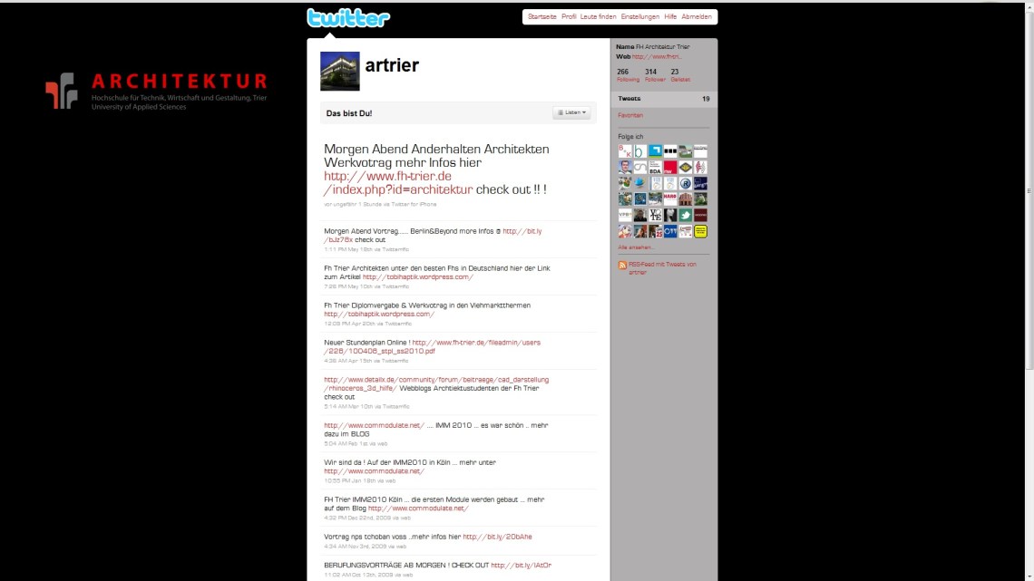 FH Trier Architektur auch auf twitter.com tobihaptik5. Juli 2010 Beitrags-Navigation VorherigerWeiter Hier nochmal die FH Trier Architektur Twitter Adresse ! Damit bekommt ihr immer die neusten Infos rund um unseren Fachbereich ! einfach auf das Bild klicken Teilen Sie dies mit: Klick, um auf Facebook zu teilen (Wird in neuem Fenster geöffnet) Facebook Klicke, um auf X zu teilen (Wird in neuem Fenster geöffnet) X Klick, um auf Pinterest zu teilen (Wird in neuem Fenster geöffnet) Pinterest Klicken, um einem Freund einen Link per E-Mail zu senden (Wird in neuem Fenster geöffnet) E-Mail Klick, um auf LinkedIn zu teilen (Wird in neuem Fenster geöffnet) LinkedIn Mehr Klicken zum Ausdrucken (Wird in neuem Fenster geöffnet) Drucken Klick, um auf Tumblr zu teilen (Wird in neuem Fenster geöffnet) Tumblr Zum Teilen auf RSS FEED klicken (Wird in neuem Fenster geöffnet) RSS FEED Klick, um auf Reddit zu teilen (Wird in neuem Fenster geöffnet) Reddit Gefällt mir Wird geladen …