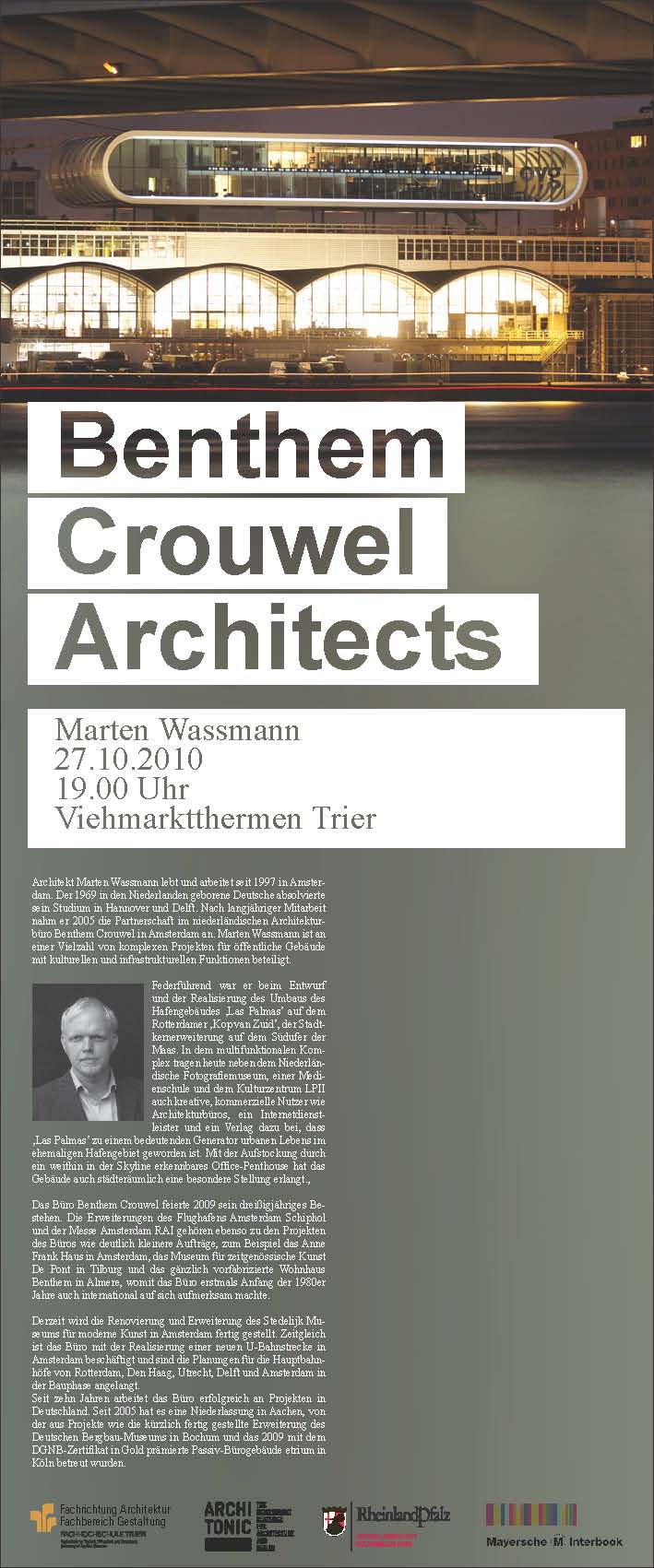 nahm er 2005 die Partnerschaft im niederländischen Architekturbüro Benthem Crouwel in Amsterdam an. Marten Wassmann ist an einer Vielzahl von komplexen Projekten für öffentliche Gebäude mit kulturellen und infrastrukturellen Funktionen beteiligt. Federführend war er beim Entwurf und der Realisierung des Umbaus des Hafengebäudes ‚Las Palmas’ auf dem Rotterdamer ‚Kop van Zuid’,der Stadtkernerweiterung auf dem Südufer der Maas. In dem multifunktionalen Komplex tragen heute neben dem Niederländischen Fotografiemuseum, einer Medienschule und dem Kulturzentrum LPII auch kreative, kommerzielle Nutzer wie Architekturbüros, ein Internetdienstleister und ein Verlag dazu bei, dass ‚Las Palmas’ zu einem bedeutenden Generator urbanen Lebens im ehemaligen Hafengebiet geworden ist. Mit der Aufstockung durch ein weithin in der Skyline erkennbares Office-Penthouse hat das Gebäude auch städteräumlich eine besondere Stellung erlangt.Das Büro Benthem Crouwel feierte 2009 sein dreißigjähriges Bestehen.Die Erweiterungen des Flughafens Amsterdam Schiphol