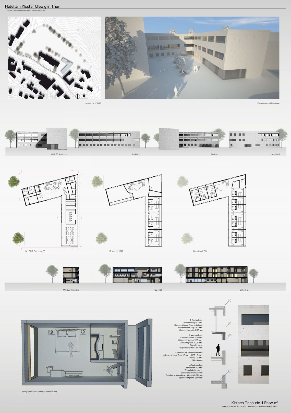 Die Aufgabenstellung: Auf dem Gelände des ehemaligen Klosters Olewig soll ein Hotel als Ergänzung der bestehenden Hotel- und Gastronomieanlage „Becker´s“ geplant werden. Es gehört zu den besten Küchen in Deutschland und wird in nationalen wie internationalen Gourmetführern an vorderster Stelle aufgeführt. Der bestehende Betrieb soll um ein Gästehaus mit eigener Küche und Restaurationsmöglichkeit ergänzt werden. In diesem eigenständigen Gebäude werden zukünftig Kochkurse für ausgewählte und zahlungskräftige Kunden durchgeführt. Die Anzahl der Teilnehmer eines Kurses ist auf 8 Personen beschränkt. Die dabei erarbeiteten mehrgängigen Menüs werden im Anschluss an den Kurs mit den Gästen gemeinsam verzehrt. Die Anzahl der Sitzplätze in dem Restaurantbereich ist auf 32 Personen beschränkt. Für diese müssen 16 Zimmer als Übernachtungsmöglichkeit zur Verfügung gestellt werden können.