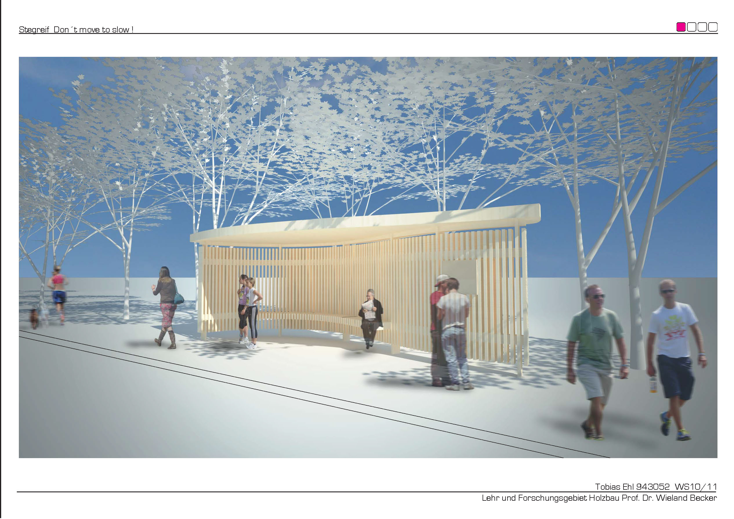 Aufgabenstellung: Entwerfen Sie eine „moderne“ Interpretation einer Bushaltestelle. Als Konstruktionsmittel wurde der Werkstoff Holz vorgegeben.Stegreif Haltestelle „Don´t move to slow“