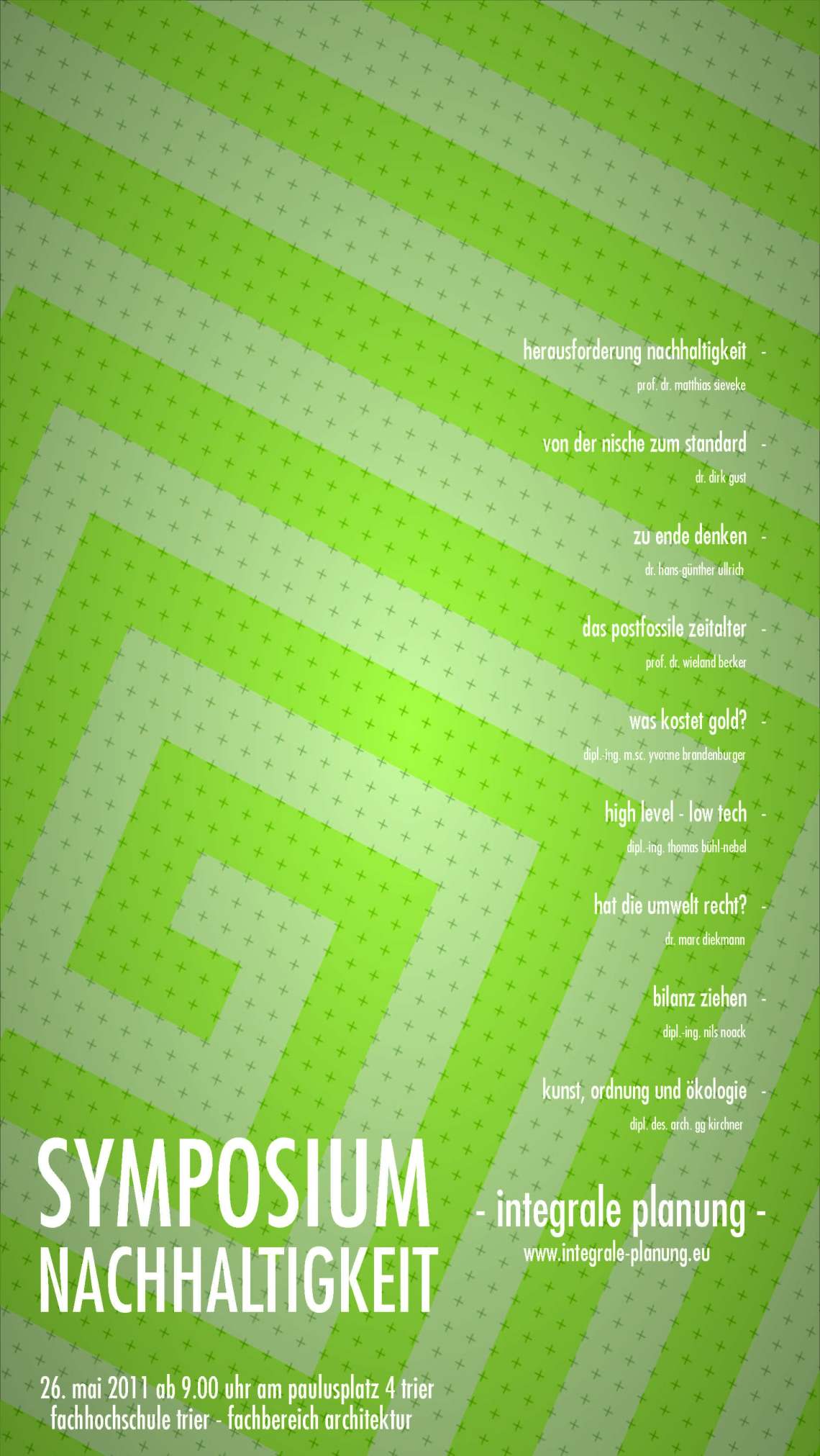 Im Rahmen der neu ins Leben gerufenen Vortragsreihe „Integrale Planung“ findet erstmalig am 26.Mai 2011 in Trier ein international ausgerichtetes Symposium statt. „Nachhaltigkeit“ ist einen Initiative der Fachrichtung Architektur des Fachbereiches Gestaltung der Fachhochschule Trier.