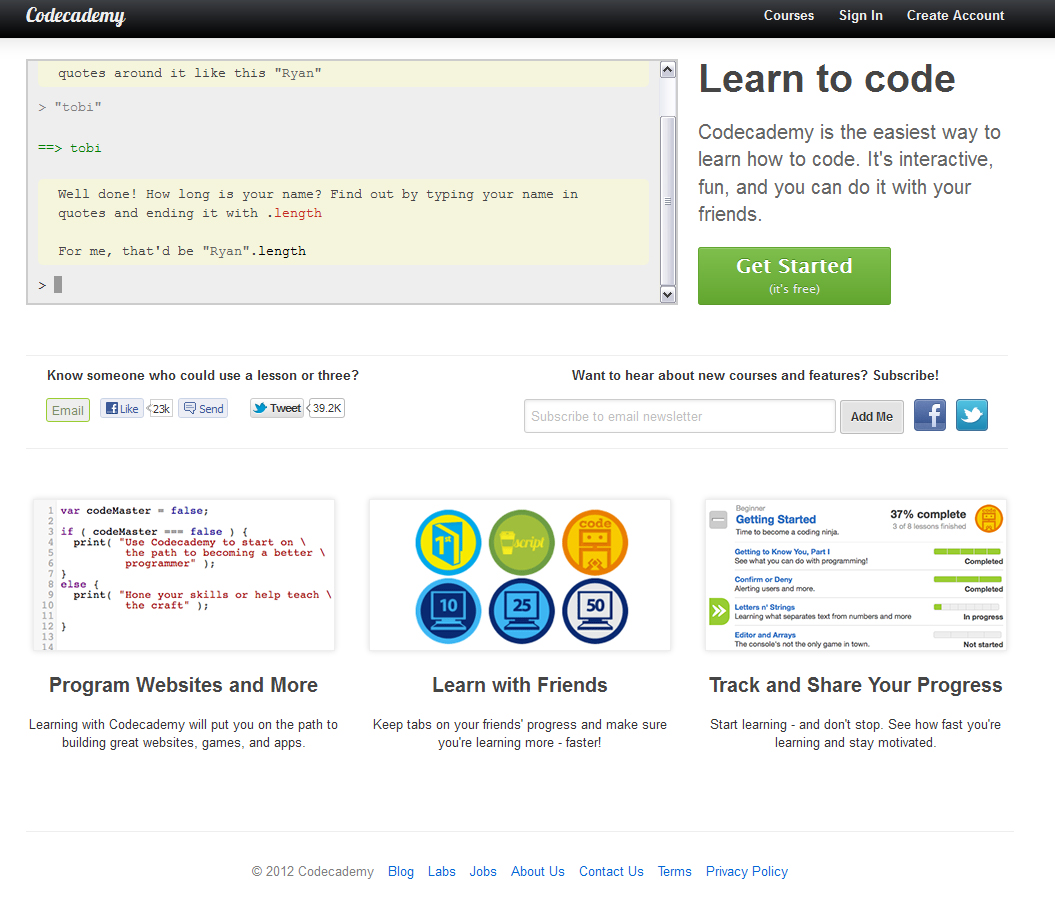 learn to code …. Codecademy tobihaptik2. Januar 2012Rhino Beitrags-Navigation VorherigerWeiter Codecademy das ist ja mal sehr nice gemacht 🙂 mit codecademy könnt ihr ganz einfach in kurzen interaktiven lektionen lernen zu programieren… for free ! let´s start coding… bitte auf das bild klicken … have fun ! cheers! Teilen Sie dies mit: Klick, um auf Facebook zu teilen (Wird in neuem Fenster geöffnet) Facebook Klicke, um auf X zu teilen (Wird in neuem Fenster geöffnet) X Klick, um auf Pinterest zu teilen (Wird in neuem Fenster geöffnet) Pinterest Klicken, um einem Freund einen Link per E-Mail zu senden (Wird in neuem Fenster geöffnet) E-Mail Klick, um auf LinkedIn zu teilen (Wird in neuem Fenster geöffnet) LinkedIn Mehr Klicken zum Ausdrucken (Wird in neuem Fenster geöffnet) Drucken Klick, um auf Tumblr zu teilen (Wird in neuem Fenster geöffnet) Tumblr Zum Teilen auf RSS FEED klicken (Wird in neuem Fenster geöffnet) RSS FEED Klick, um auf Reddit zu teilen (Wird in neuem Fenster geöffnet) Reddit Gefällt mir Wird geladen …