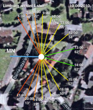 Sonnenstand zeigt die Position der Sonne für jede volle Stunde von Auf- bis Untergang grafisch an. Entweder auf einer Karte, oder auf neutralem Hintergrund.